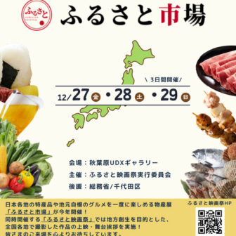 名 称ふるさと市場(ふるさと映画祭2024)会 場秋葉原UDXギャラリー日 程2024年12月27日(金) ~ 2024年12月29日(日) 時 間12/27 13:00 ~ 20:00、12/28 1…